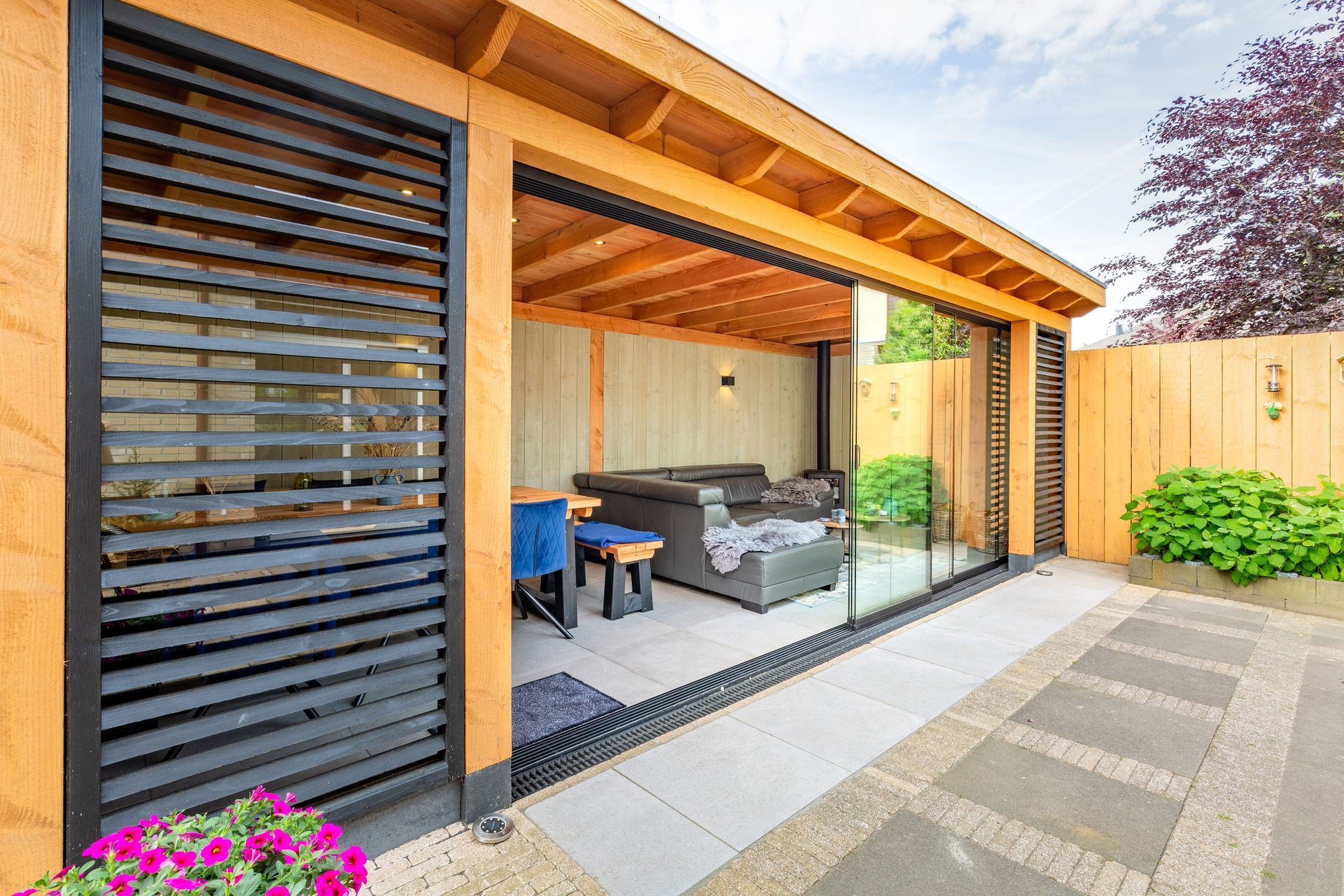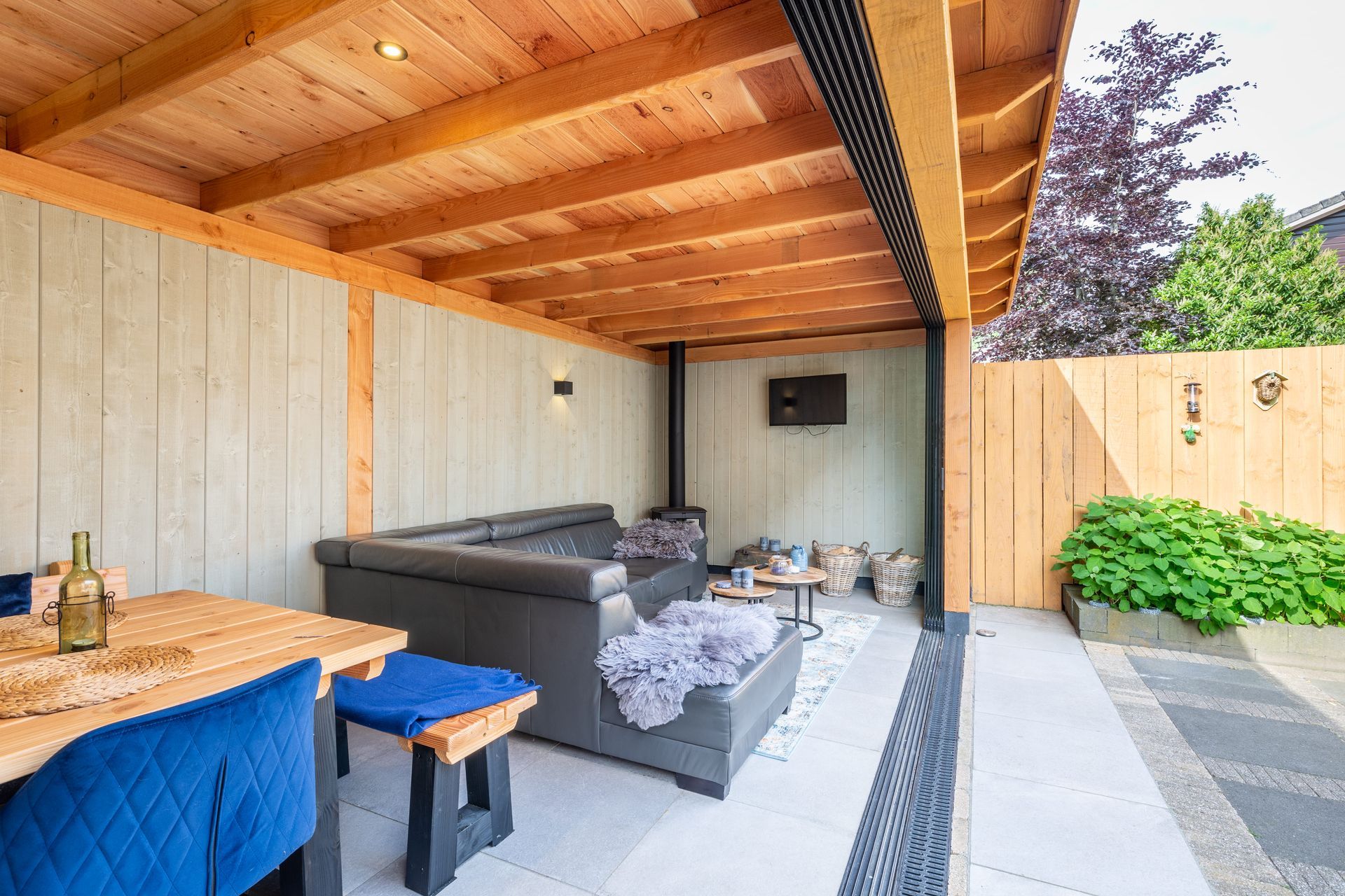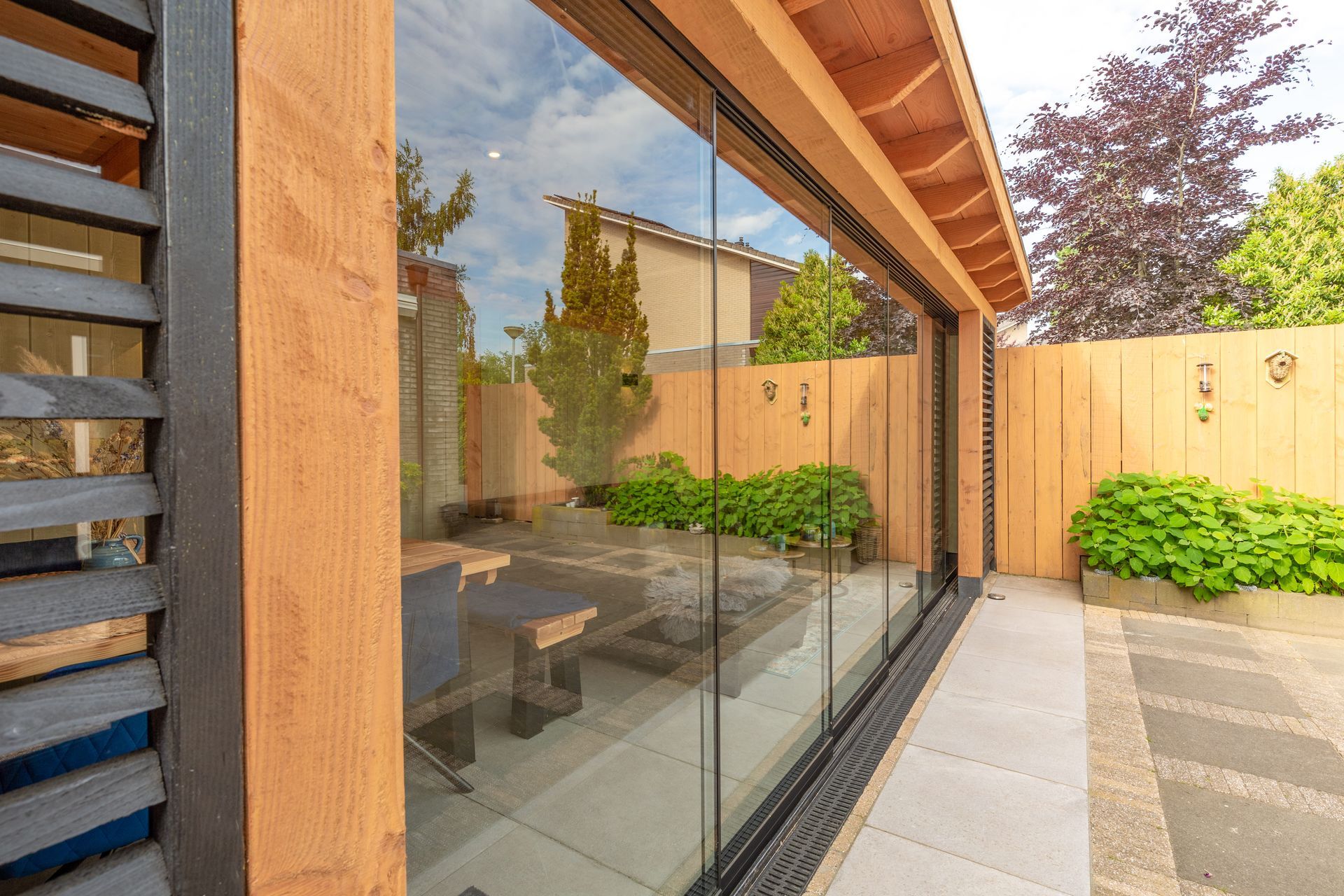 In Leusden is een veranda met glaswanden gerealiseerd voor extra comfort en lichtinval. Teunissen Houtbouw verzorgde het complete proces, inclusief plaatsing van de glaswanden en afwerking.